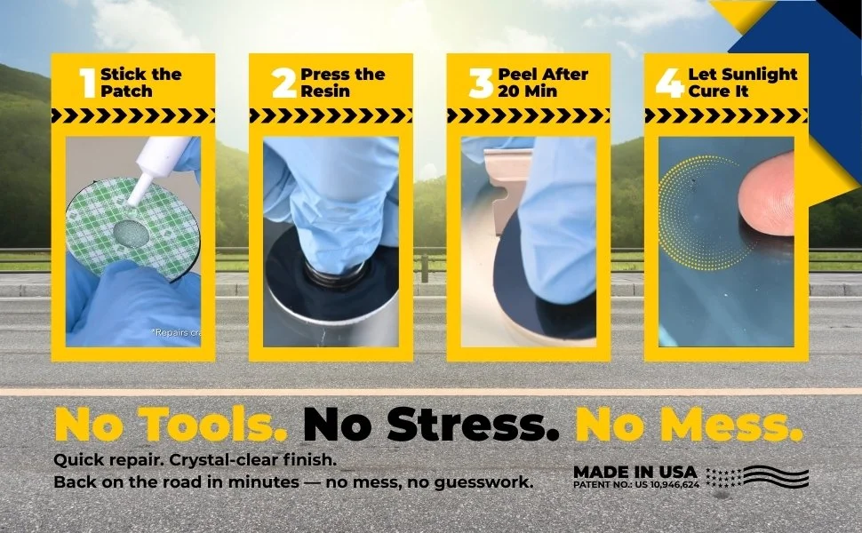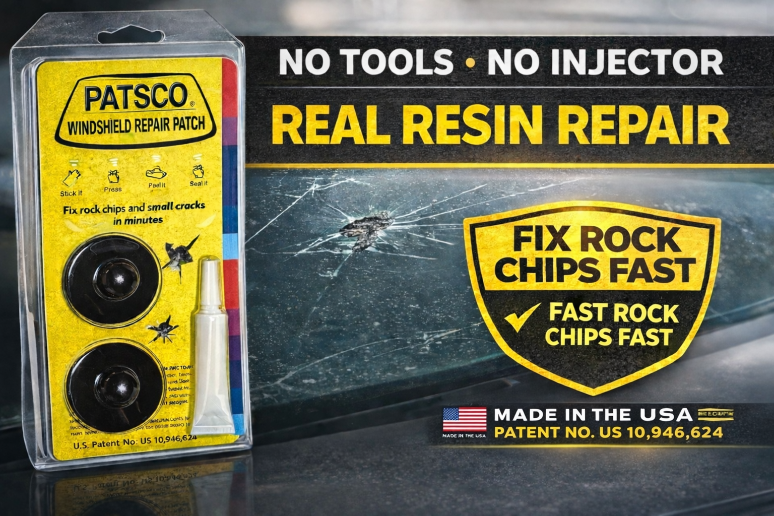 1. REAL WINDSHIELD REPAIR – WITH RESIN Unlike temporary fixes, Patsco uses a resin-based repair system built into a patch, helping fill rock chips and improve clarity while preventing cracks from spreading. It's that easy, Hallelujah!